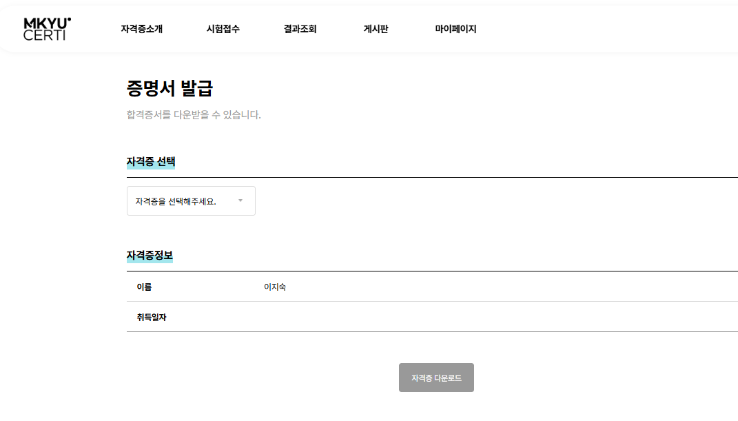 MKYUCerti 홈페이지 (https://mkyucerti.co.kr) 접속 > 결과 조회 > 증명서 발급