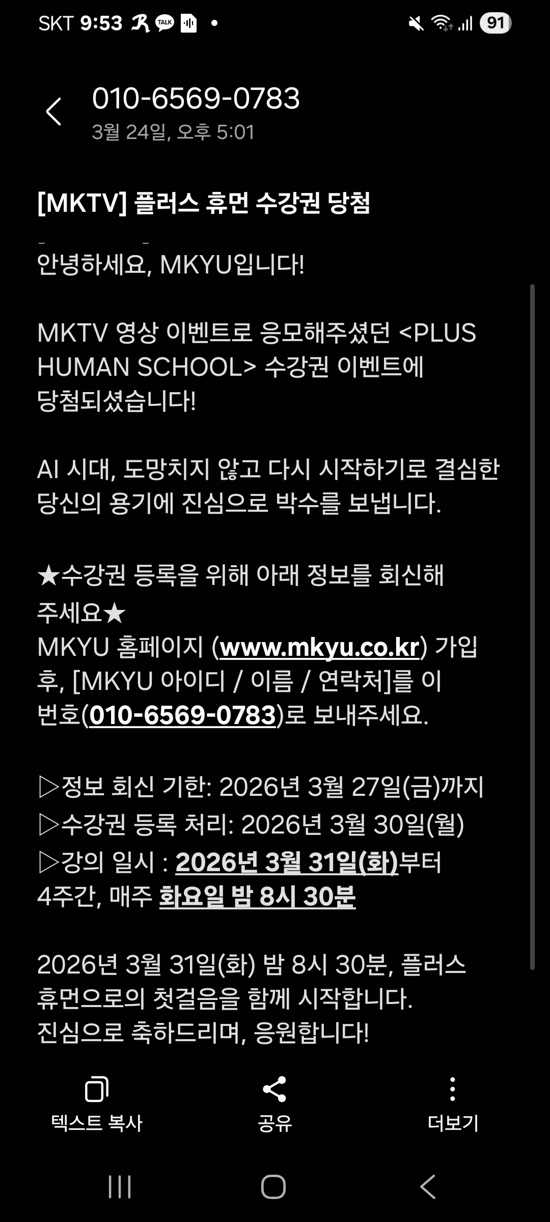 PLUS HUMAN SCHOOL 수강권 이벤트 당첨됐다고 010-6569-0783 번호로 안내문자 3/24일에 받았고