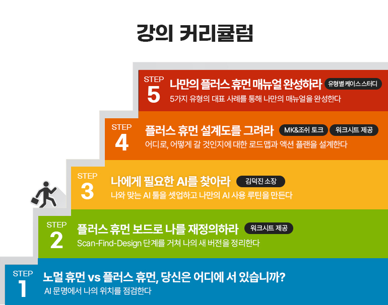 이 워크시트까지 완성해야 비로소 AI 시대에 플러스 휴먼으로 살아갈 나만의 매뉴얼이 완성되는 거랍니다! 즉, 강의가 끝난 뒤 “그래서 어떻게 해야 하는 거지?”라는 고민 없이 바로 플러스 휴먼으로 전환된 삶을 살아갈 수 있어요!