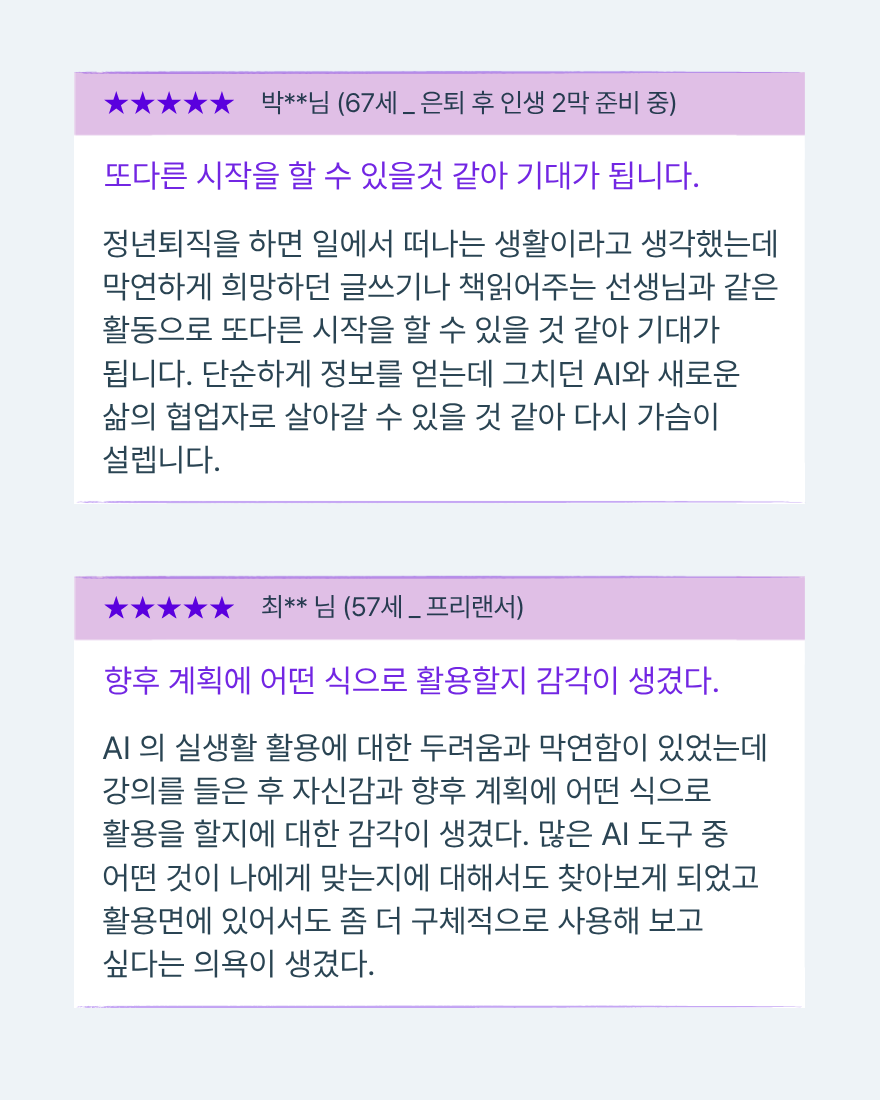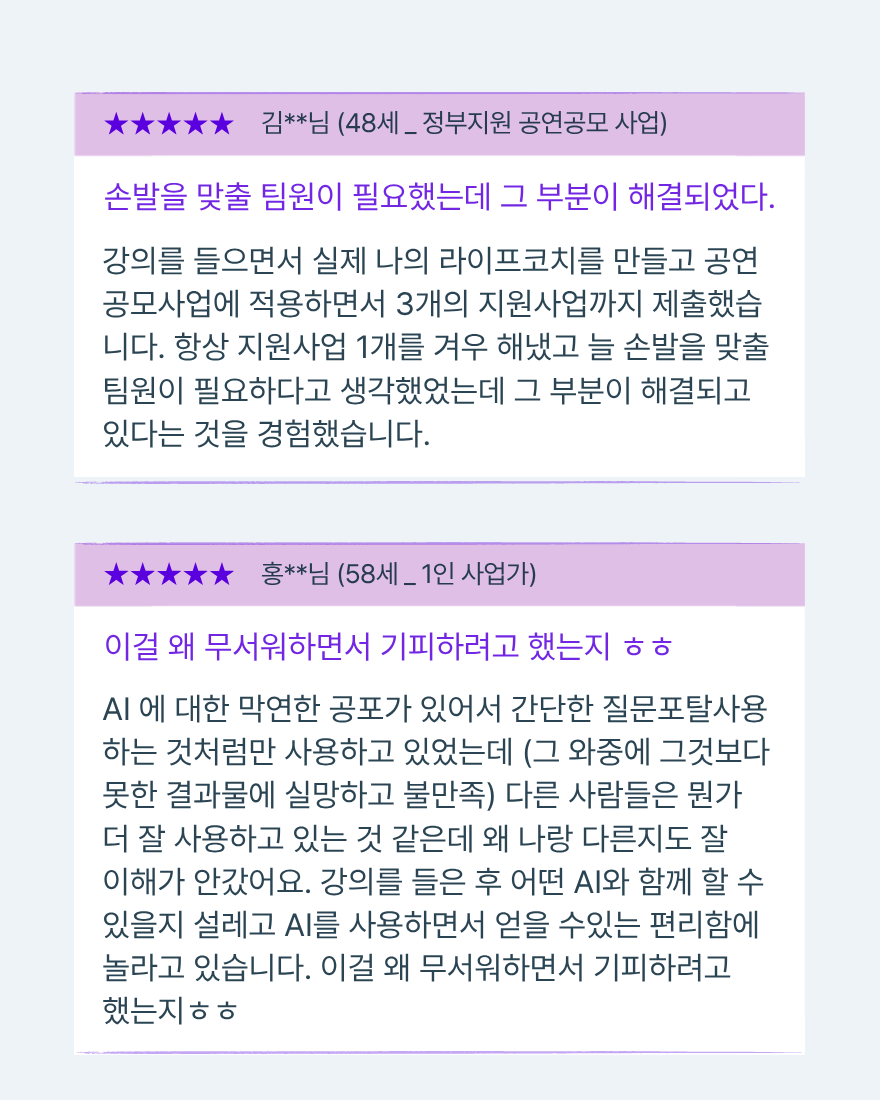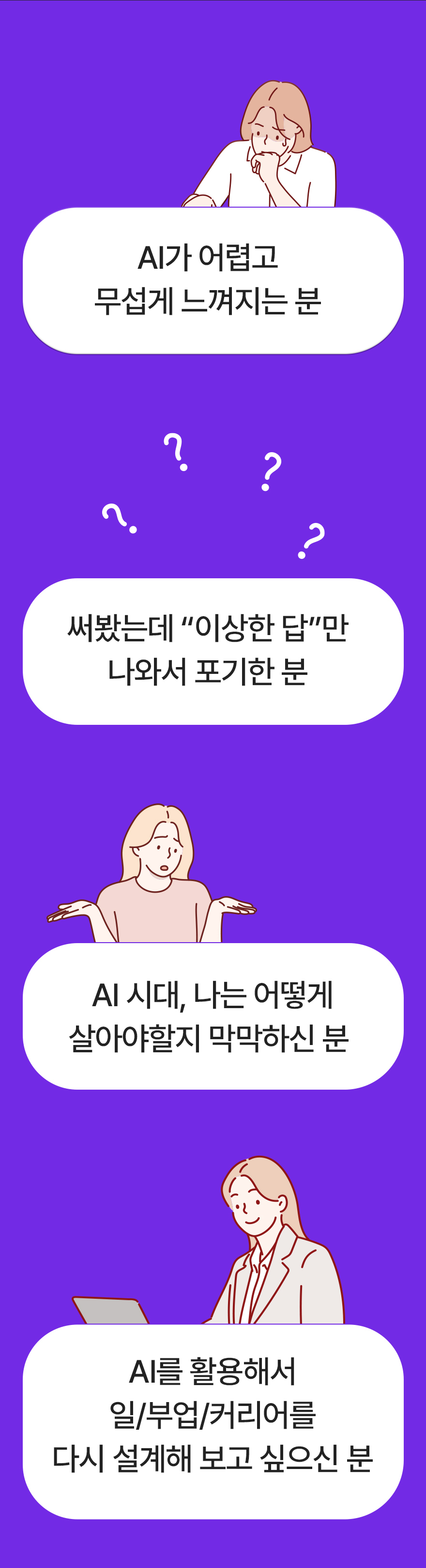 실무에서 바로 적용 가능한 AI 활용법을 누구보다 쉽게 알려주는 전문가! 수강생의 대표 페르소나별 적합한 AI 툴을 추천하고 AI 를 활용해 수익화에 성공한 벤치마킹 사례들을 소개합니다. AI 를 어떻게 오케스트레이션 해야 하는지 현실 적용 감각을 깨워드립니다.