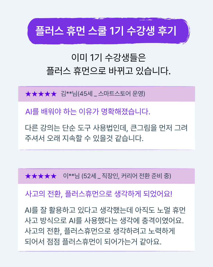 AI 초보자가 가장 무너지는 순간은 막혔을 때 혼자 버티는 것입니다. 그래서 플러스 휴먼 스쿨 1학년은 혼자 하지 않게 만드는 시스템으로 운영됩니다. 플러스 휴먼 스쿨 1학년, 얼리버드 수강생에 한해 실시간 라이브 로 함께 참여할 수 있습니다.