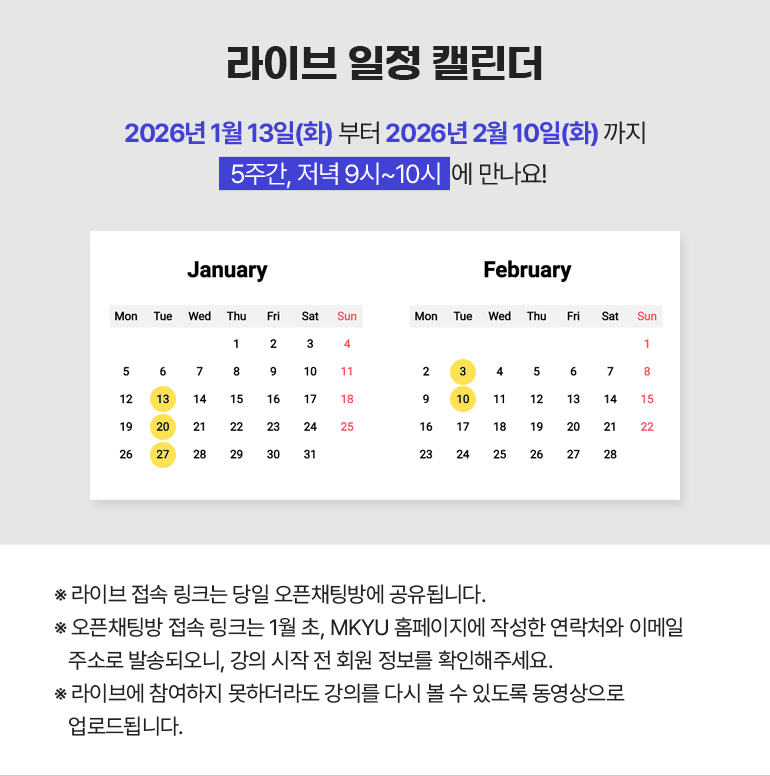 굿짹월드와 bod를 통해 “함께 하는 공부의 가치”를 우리는 충분히 잘 알고 있습니다. 2026년 1월과 2월, 강의 라이브가 진행되는 동안 여러분이 함께 소통하고 응원을 나누며 성장할 수 있도록 한시적으로 오픈채팅방을 운영합니다. 오픈채팅방은 2026년 2월 28일까지 강의가 끝난 후에도 약 2주간 더 운영됩니다.