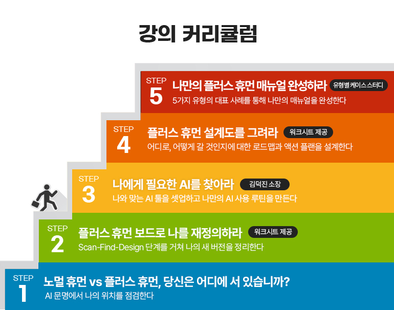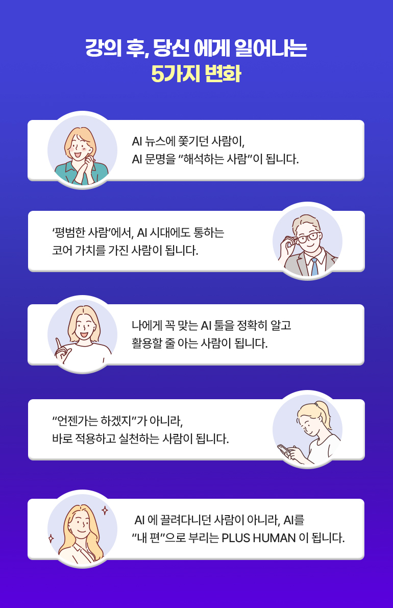 이 워크시트까지 완성해야 비로소 AI 시대에 플러스 휴먼으로 살아갈 나만의 매뉴얼이 완성되는 거랍니다! 즉, 강의가 끝난 뒤 “그래서 어떻게 해야 하는 거지?”라는 고민 없이 바로 플러스 휴먼으로 전환된 삶을 살아갈 수 있어요!