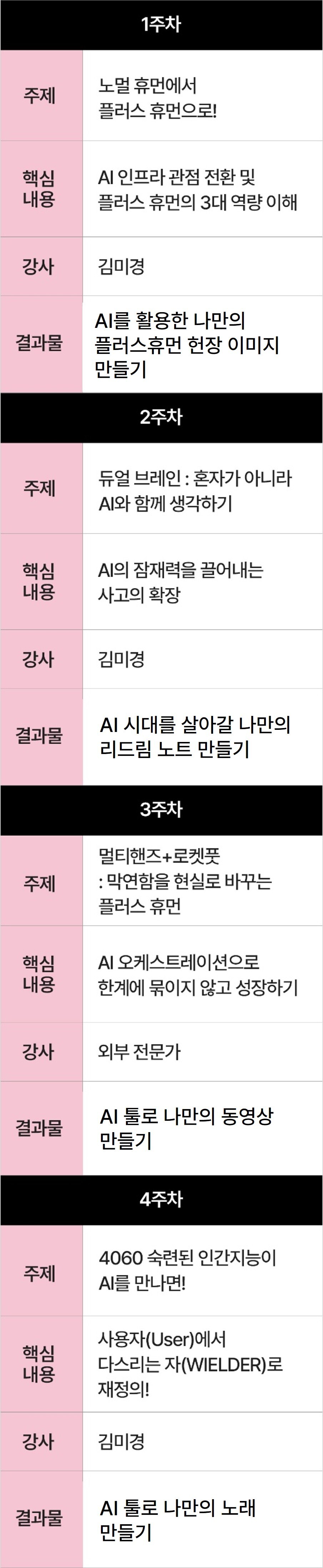 4주 라이브 + 오픈채팅 + 과제 전용 AI 도우미와 함께라면 여러분도 플러스 휴먼이 될 수 있습니다.