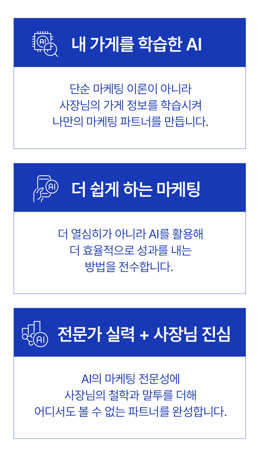 AI에게 내 가게를 학습시키고, 내 상황에 맞는 마케팅 파트너로 세팅하면 됩니다.